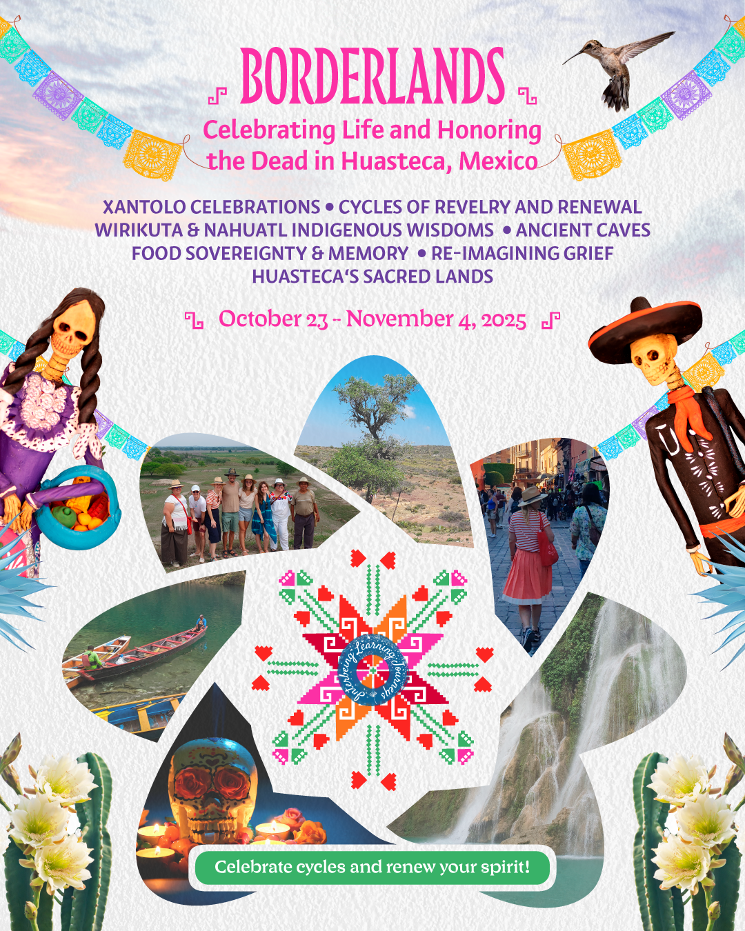 This two-week pilgrimage takes us to inhabit several of these edges, moving between the mystical desert of Wirikuta and the humid mystery of the cloud forest, being reborn in the swollen belly of the temazcal and in sacred caves—the very entrails of Mother Earth. We will reinvigorate the body with ritual fasting and celebrate the abundance of the harvest in family and community banquets. We will weave the cosmos with the ethereal dance of the hawk or renew our pact with life in communion with the desert. We will move through the solemnity of mourning, and the colorful joy of cemeteries and homes as we celebrate the return of our loved ones during the Day of the Dead.